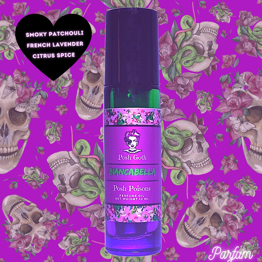 Posh Poisons by Posh Goth is a line of all natural, handmade fragrances. All fragrances are blended with love and the bones of babydolls, in addition to: therapeutic grade essential oils, phthalate-free fragrance oils, and fractionated coconut oil. To view the master list, please visit: